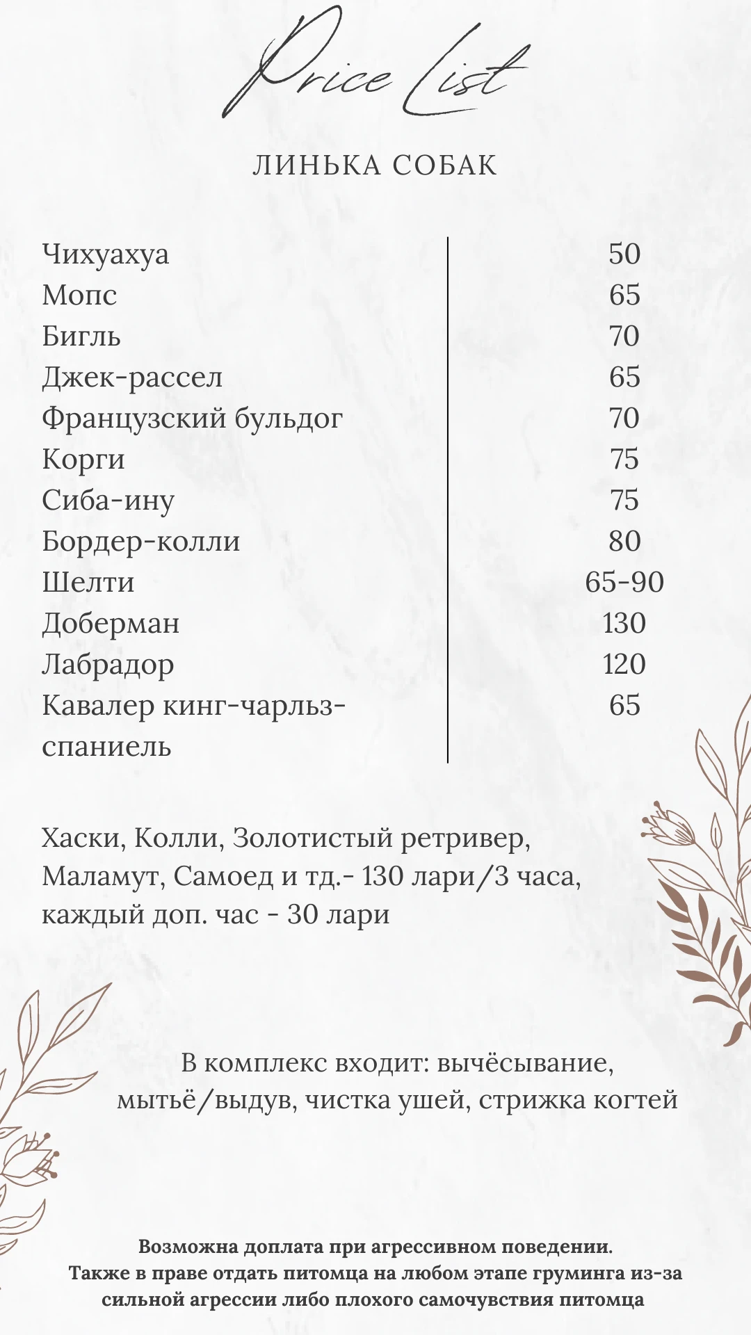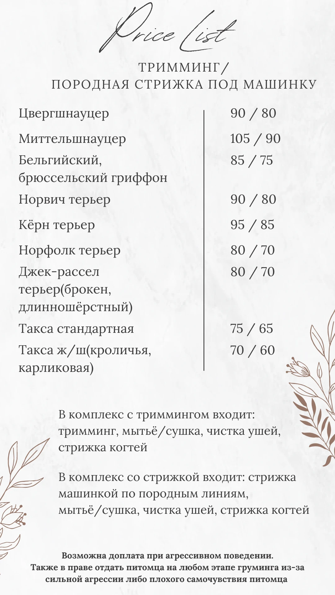 Гигиенический комплекс: Мытье/сушка, чистка ушных раковин, обработка глаз, обрезание когтей, гигиена паховой области, окантовка лапок и ушек.